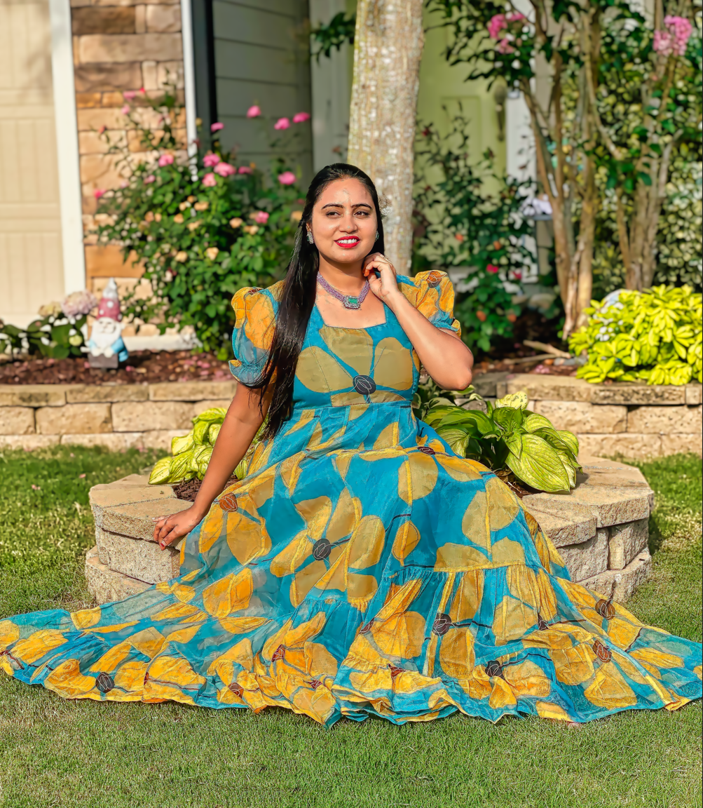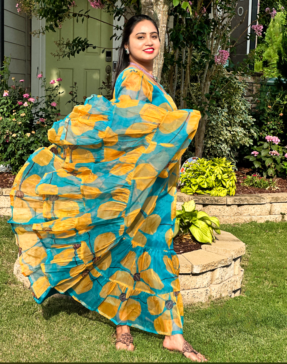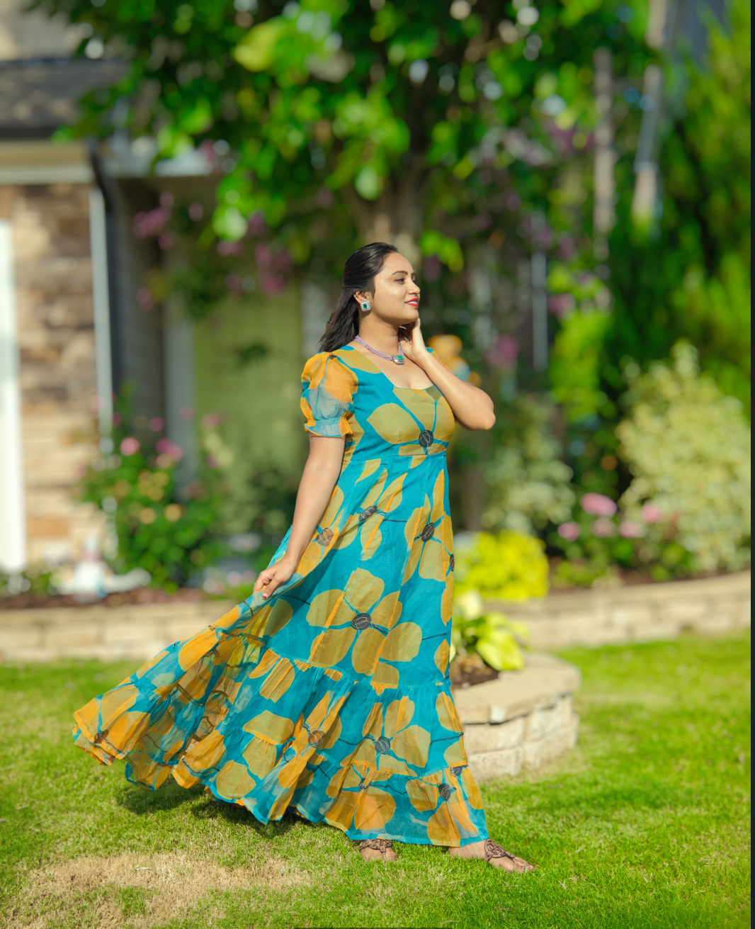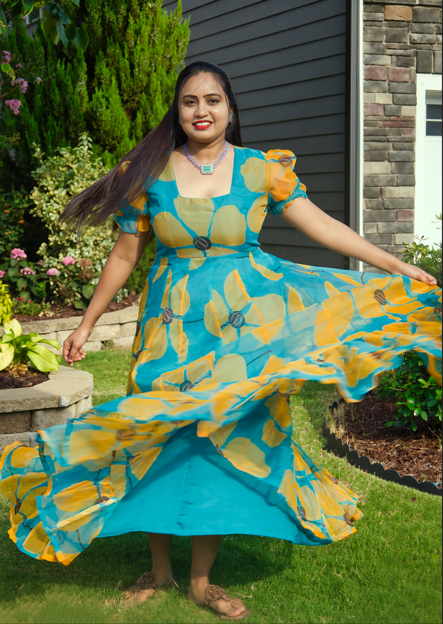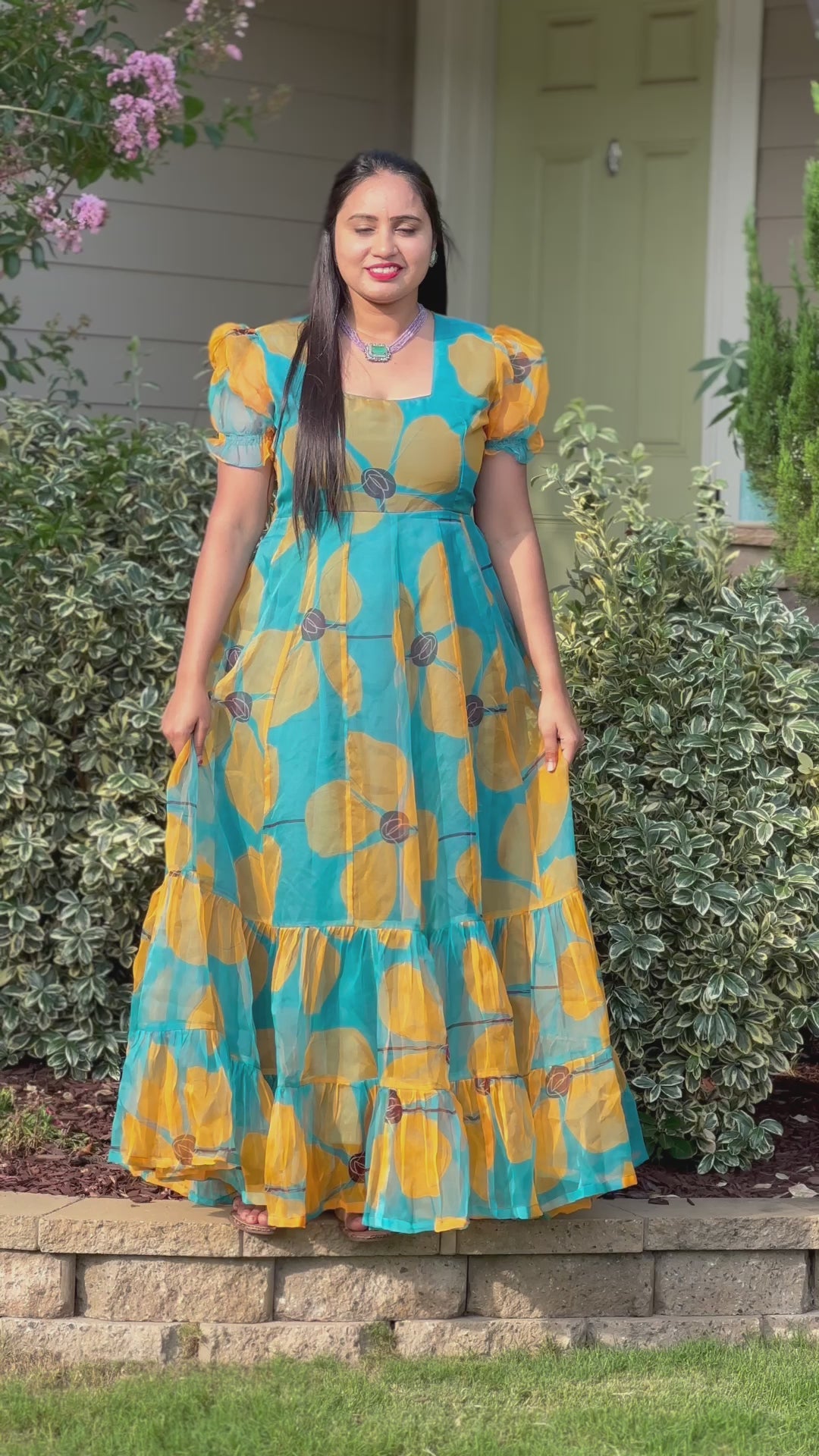 Elegant Floor-Length Heavy Flair Partywear floral Organza Gown in Teal Blue and Yellow Flowy gown