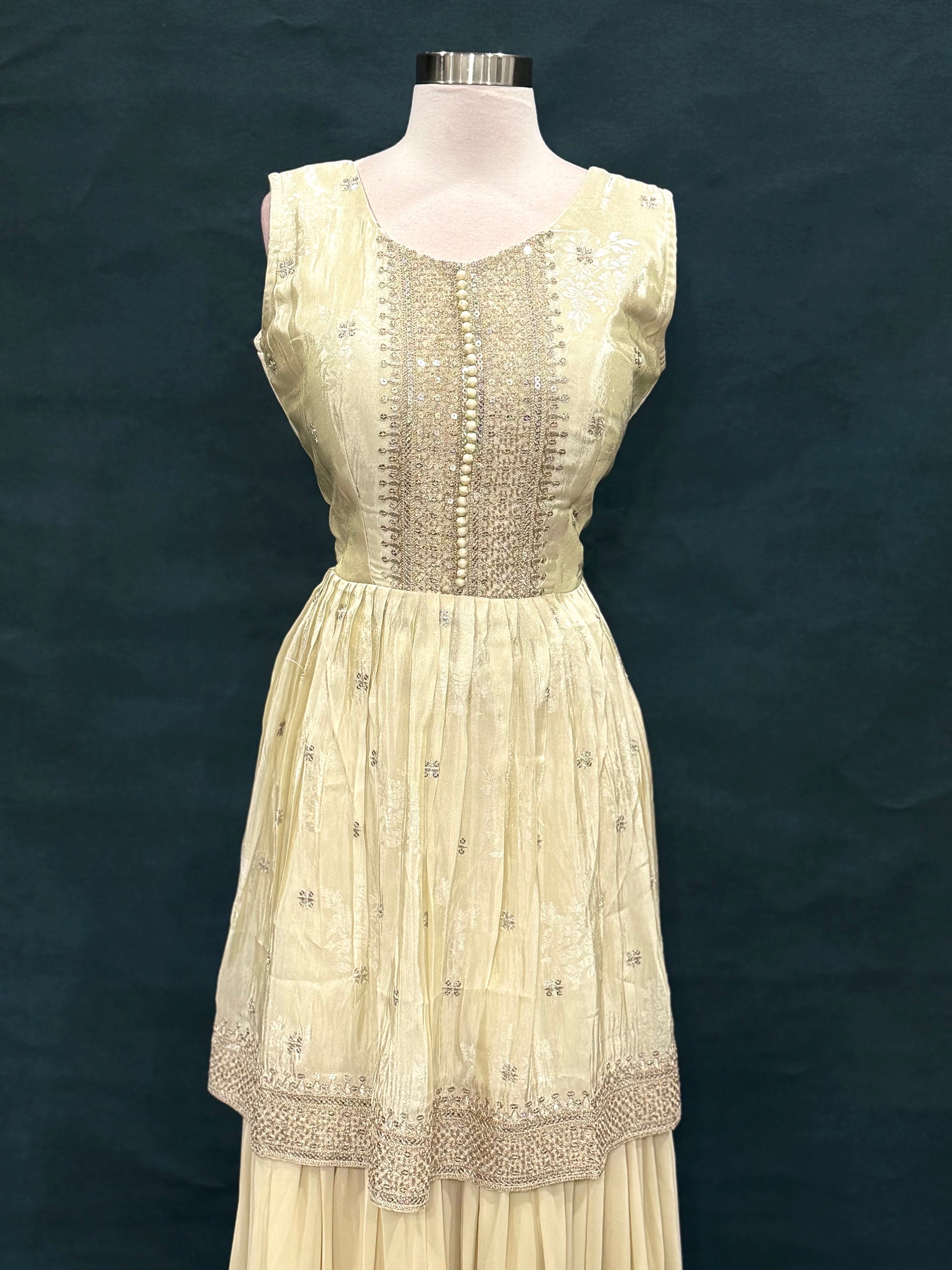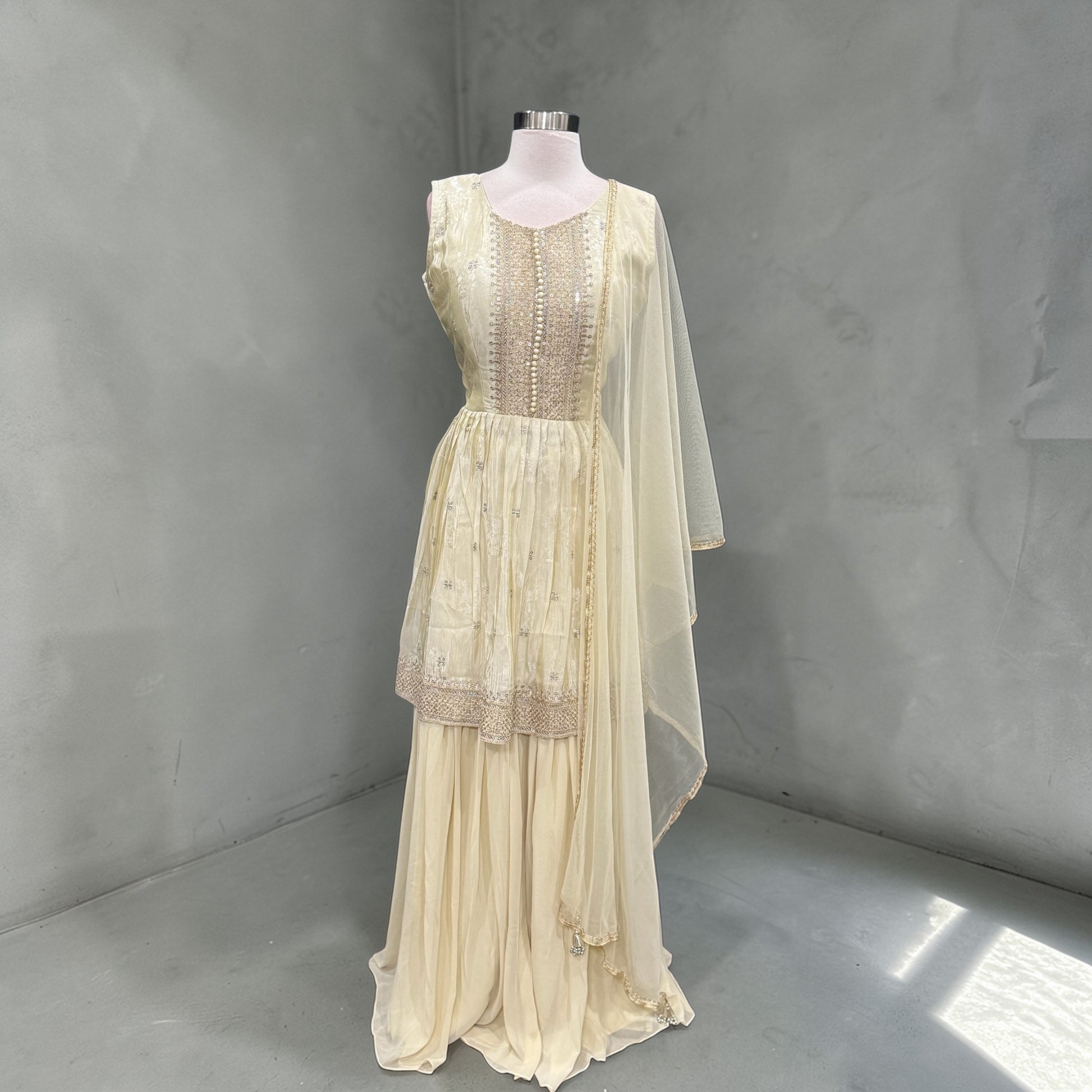 Elegant Off-white gold rich silk sharara set with delicate sequin detailing for that royal glow size 40