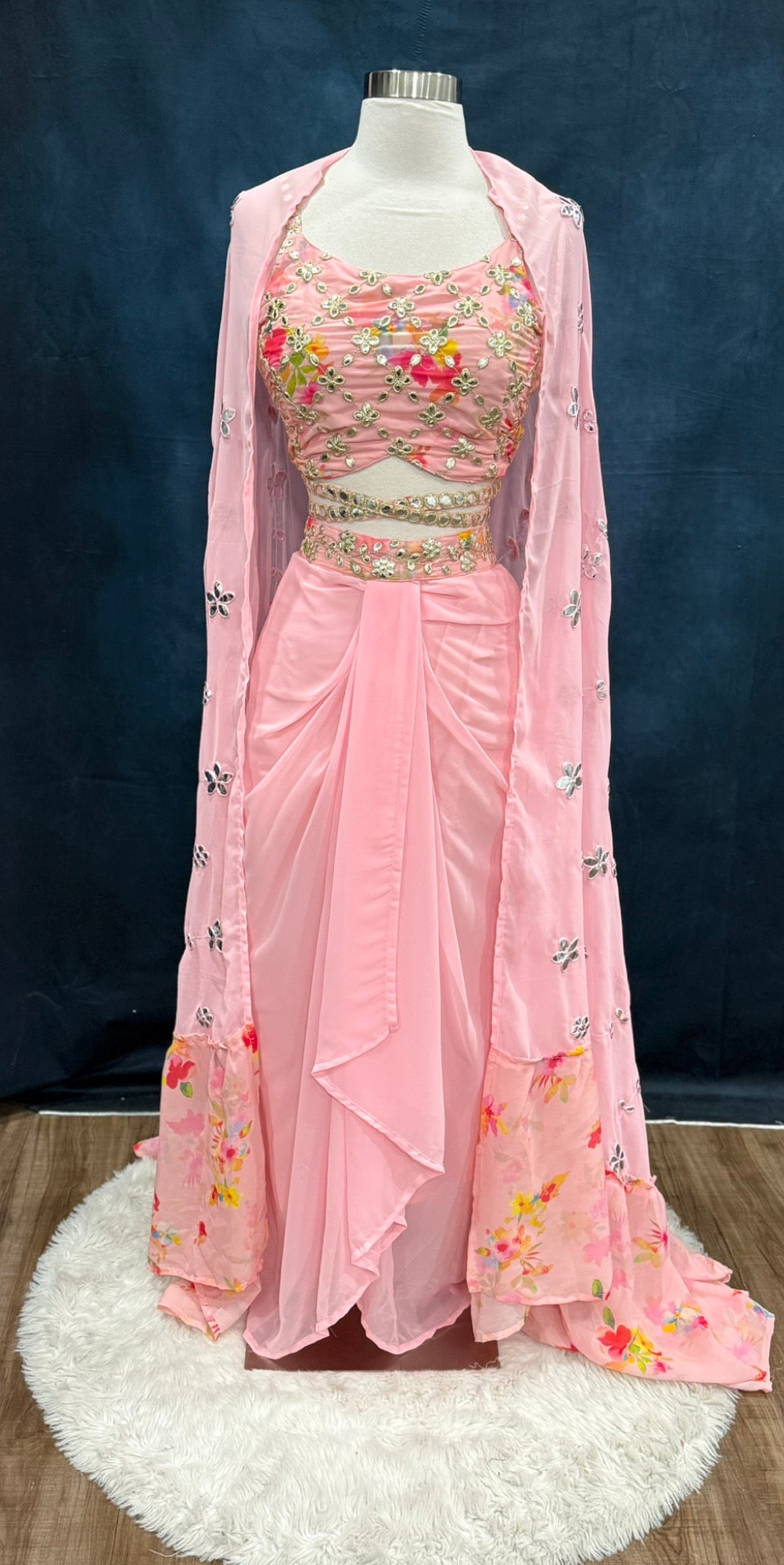 Turn heads in this stunning Indo-Western Crop Top Set in a dreamy soft pink shade 🌸 Perfect blend of traditional elegance and modern design! This beautiful outfit features a floral embroidered crop top, a stylish draped skirt, and a lightweight sheer dupatta with delicate detailing.