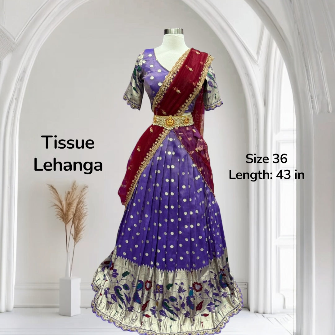 Gorgeous Tissue Half Sarees with stitched blouse for Teens/Adults. Available in size 36 length 43 Ready to ship USA