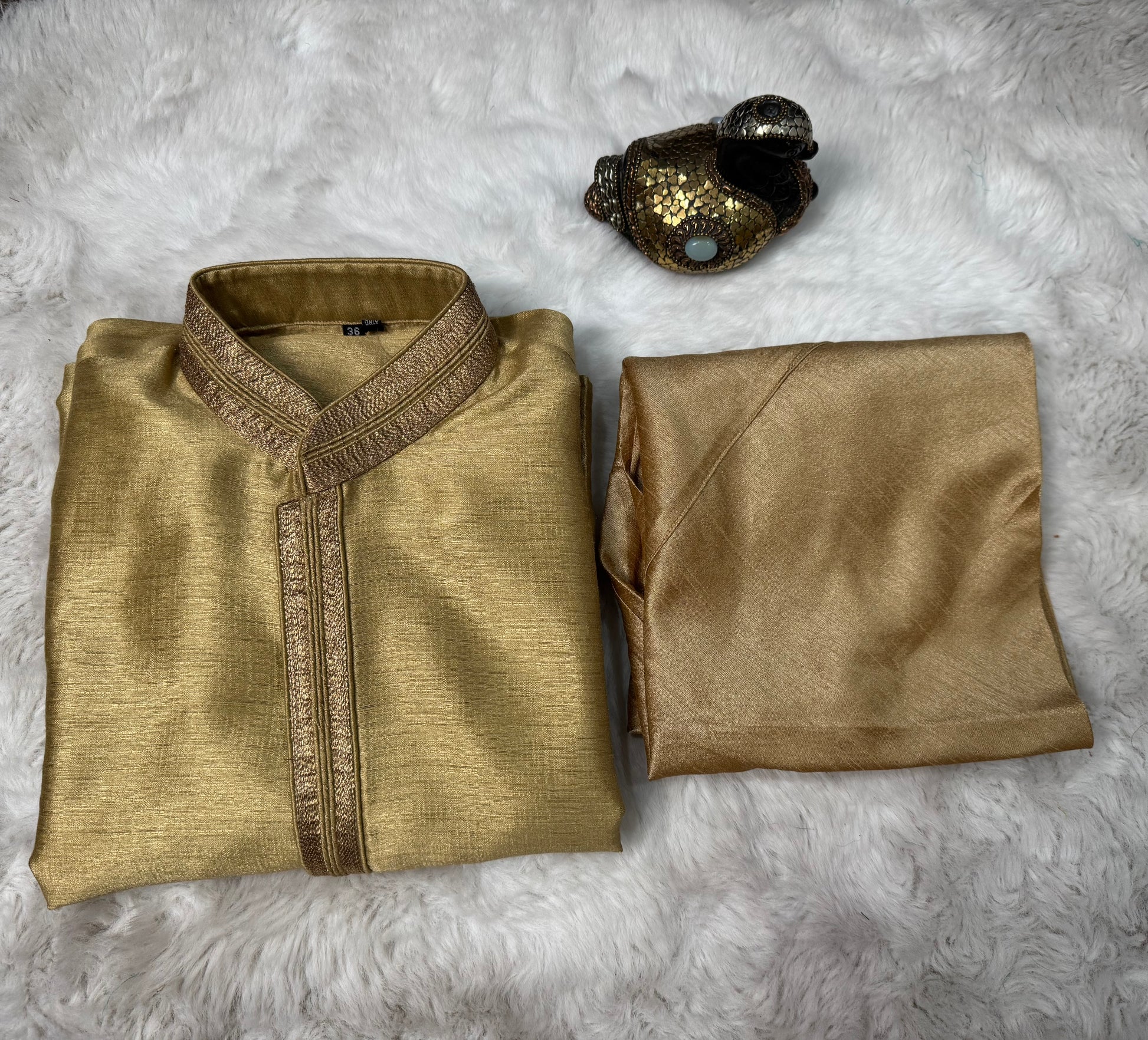 Lovely Mens raw silk kurta in gold with gold Pyjama. Available in size 36 inch