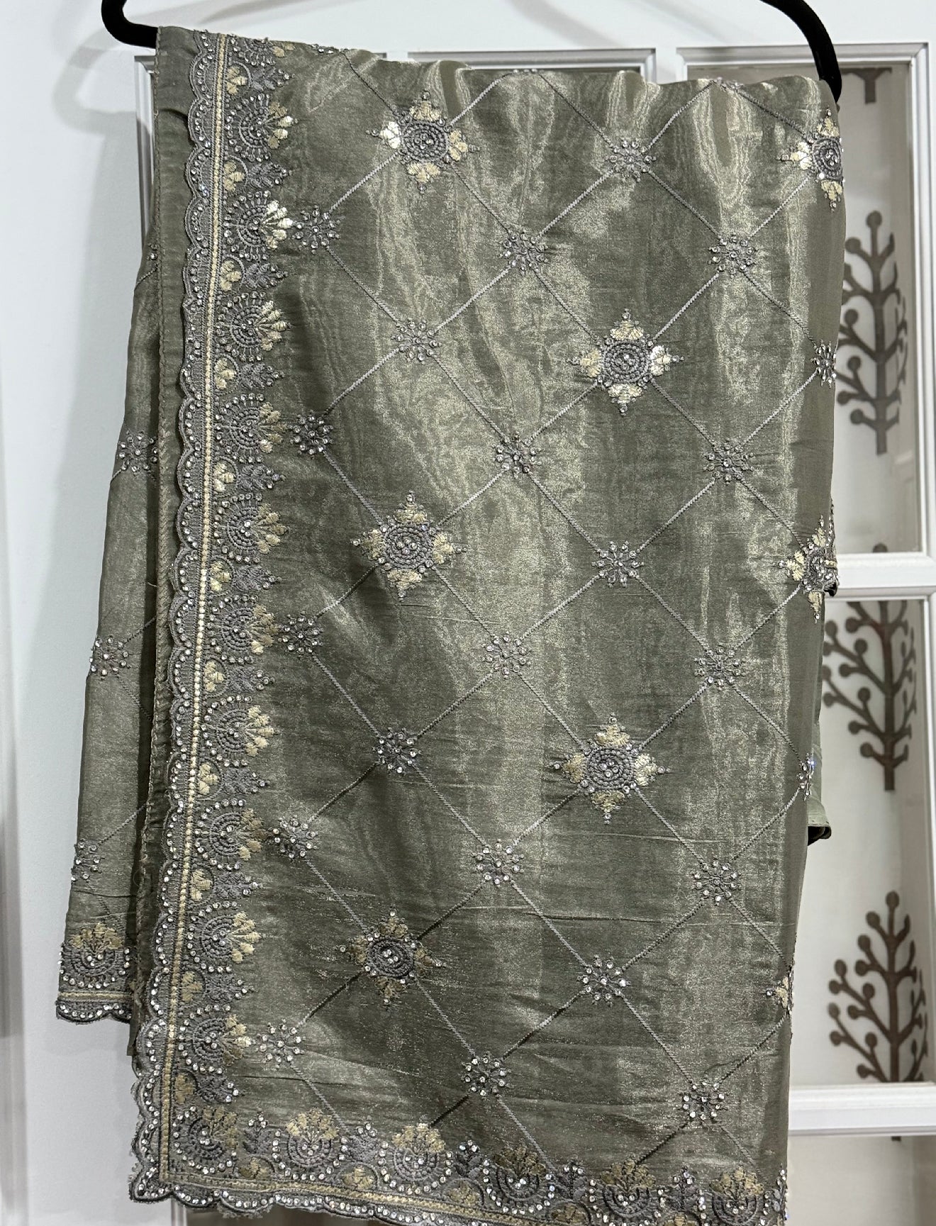 Premium Partywear organza saree. A subtle sparkle of Swarovski & elegant embroidery for a truly timeless look. Comes with matching satin inner skirt , Blouse fits 38-42.