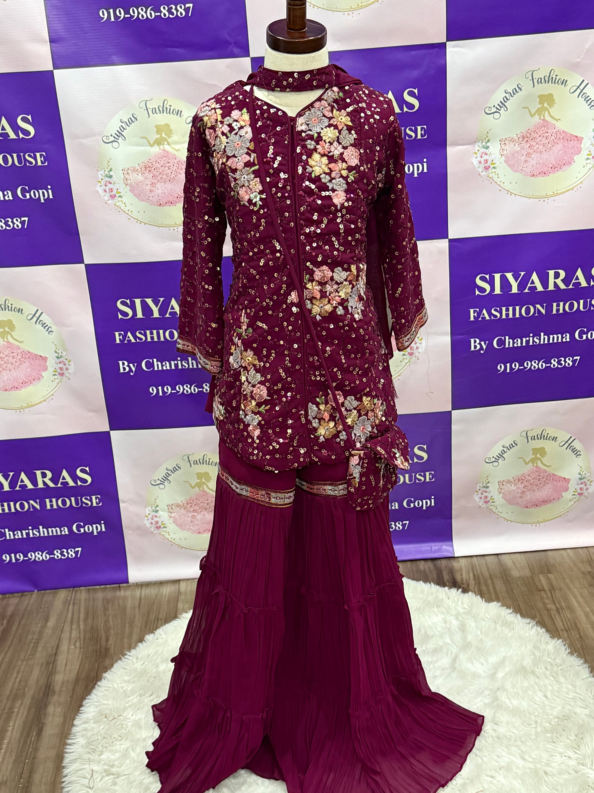 Rich maroon Sharara set with delicate floral sequin embroidery. Stylish long kurta with sequin details Perfect fit for girls 6 to 8 yrs