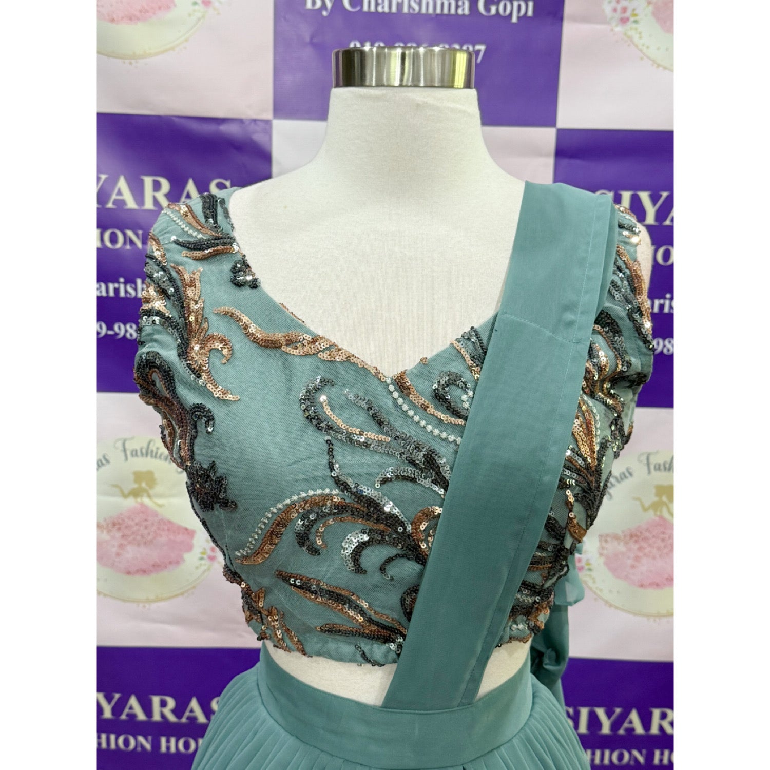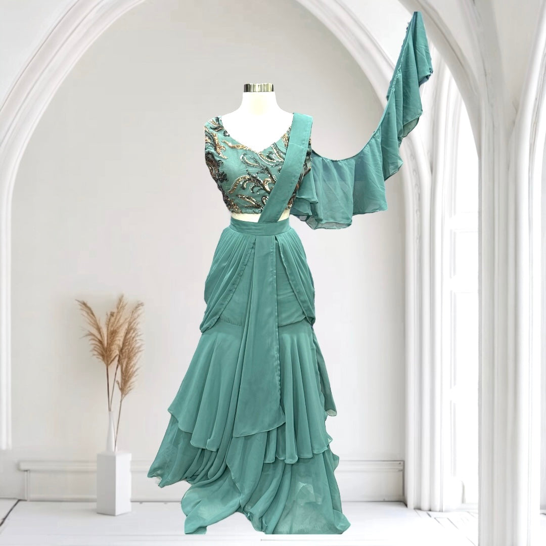 Steal the spotlight with this stunning Indo-Western drape style lehanga 😍🌸. The layered flowy skirt is available in size 38/40.