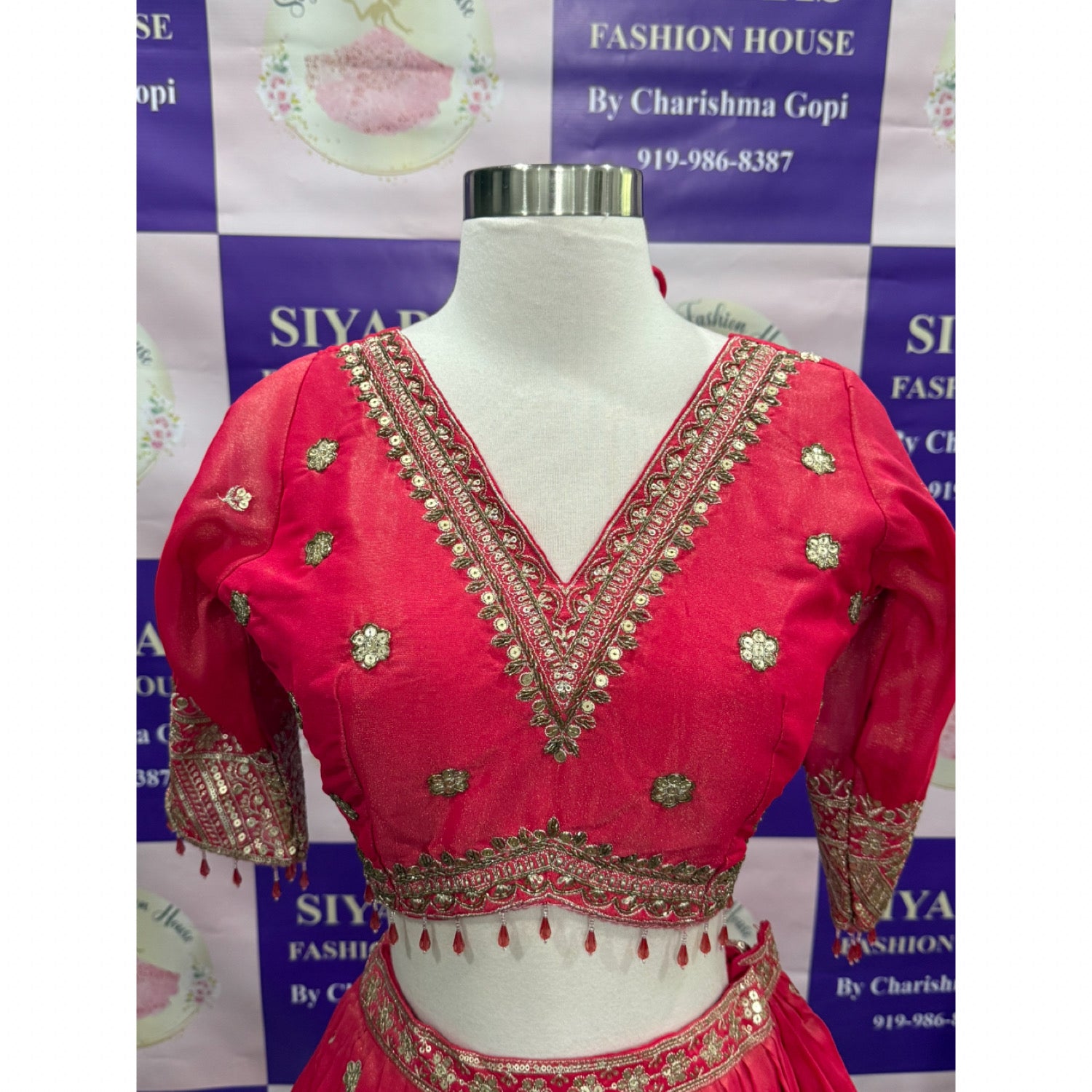Step into elegance with this tomato red tissue lehenga choli featuring golden embroidery, embellished borders, and a shimmering dupatta. Designed for brides, bridesmaids, and festive wear, this outfit blends tradition with modern sophistication.