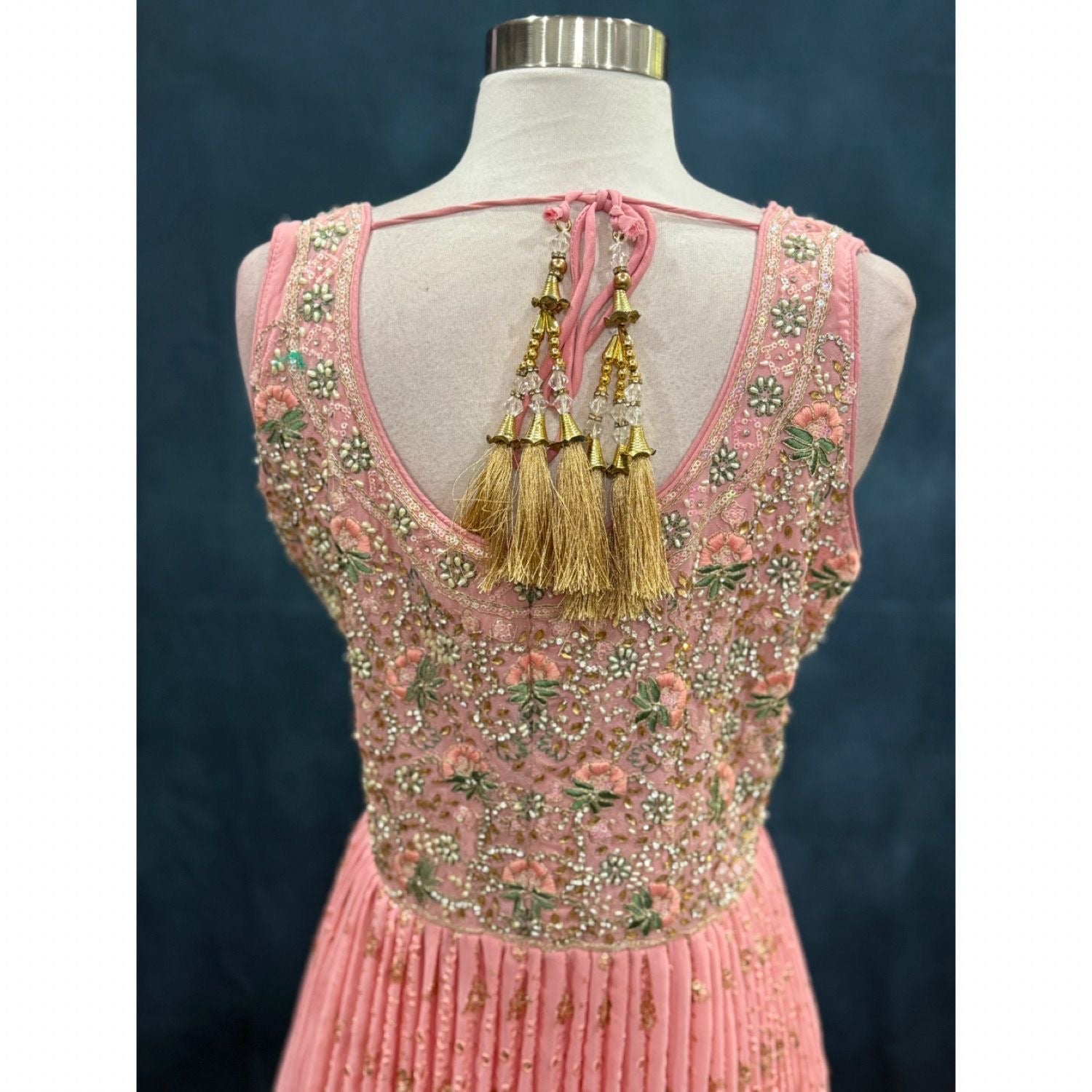 Step into elegance with this exquisite pastel pink georgette party wear gown, designed to make you the center of attention at any festive or wedding celebration. The gown features a heavily embroidered bodice adorned with delicate floral threadwork and sequin detailing, bringing a perfect blend of tradition and contemporary charm.