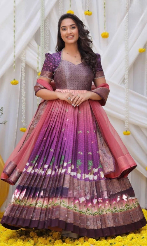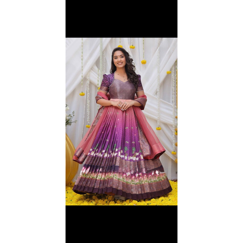 Beautiful Banarasi silk pichwai print Swarovski work long gown with matching dupatta.