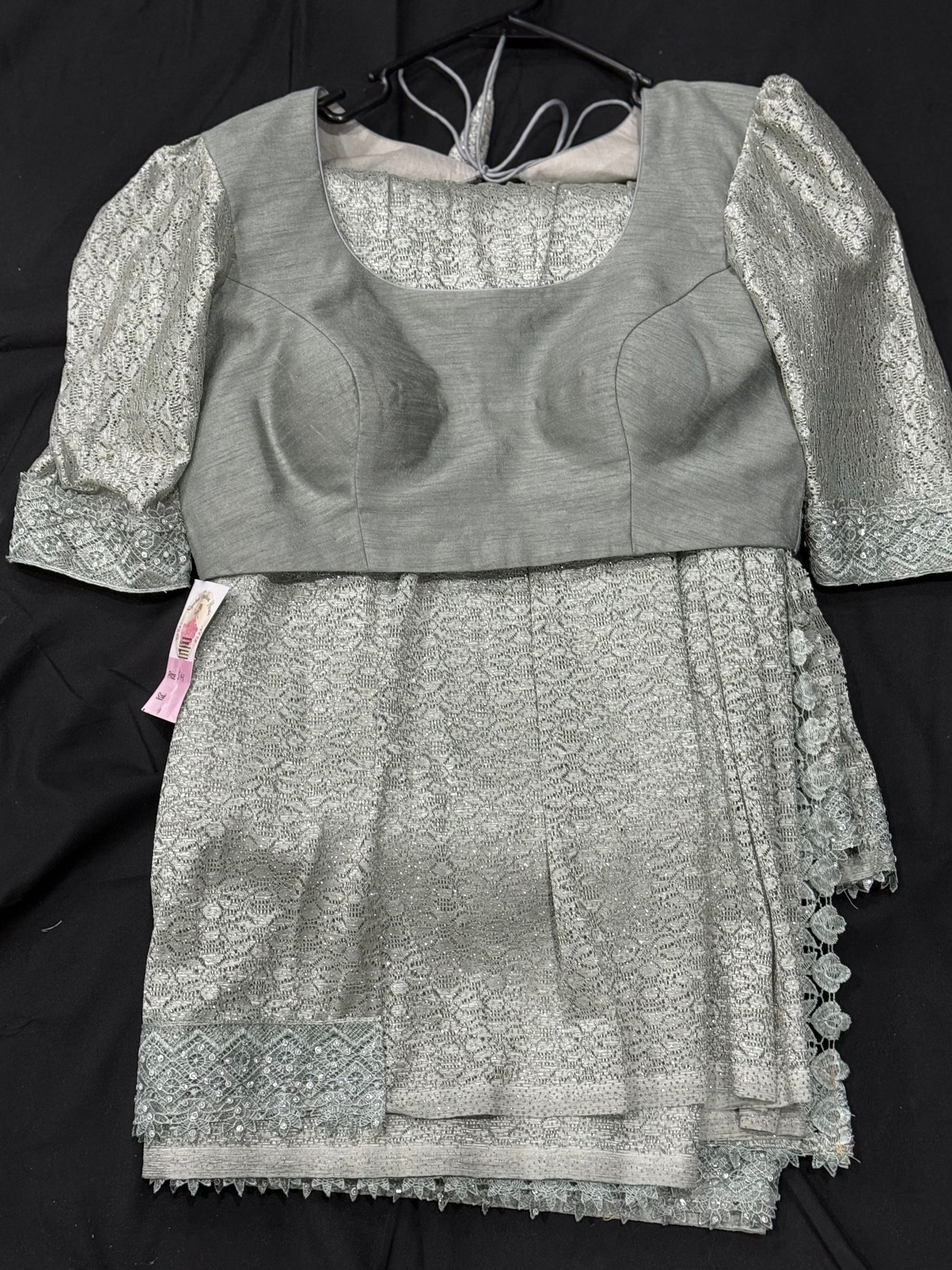Beautiful pastel green partywear shimmering saree stitched blouse stone and lace wedding reception cocktail partywear saree size 38 to 42