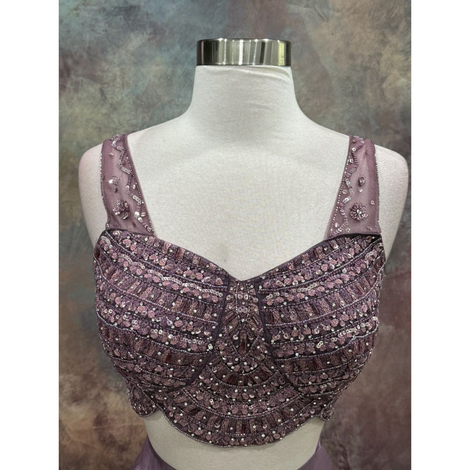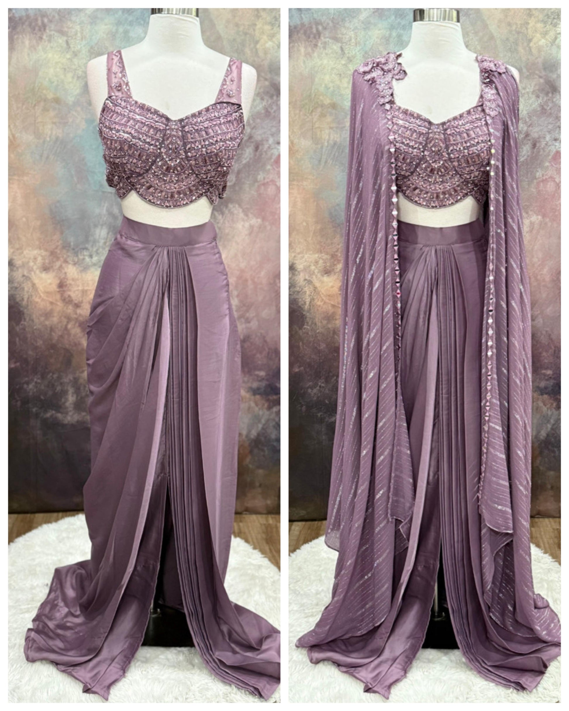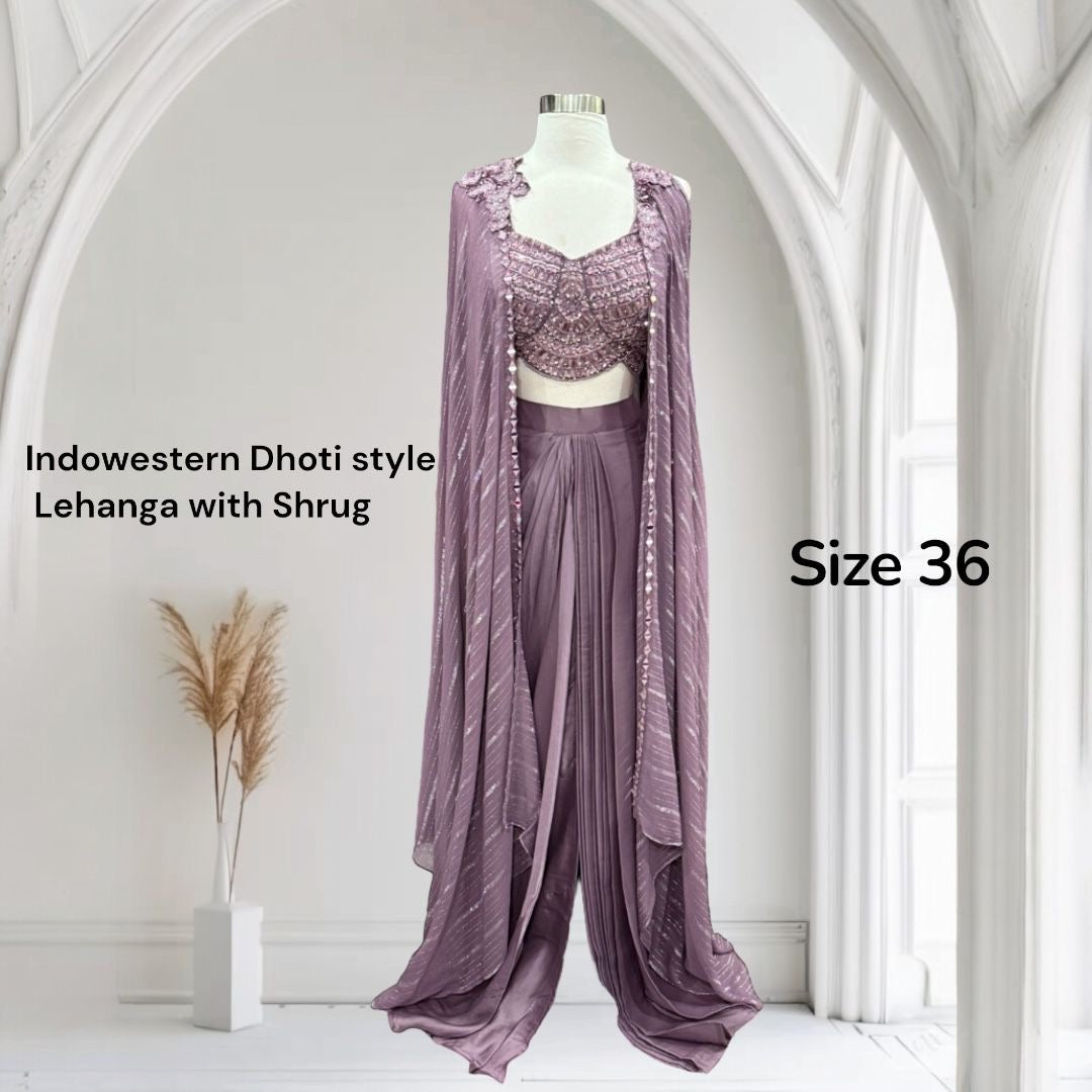 Gorgeous mauve Indo-Western outfit |Hand-embroidered crop top| flowy pleated dhoti skirt and a stunning cape-style jacket| Size 36