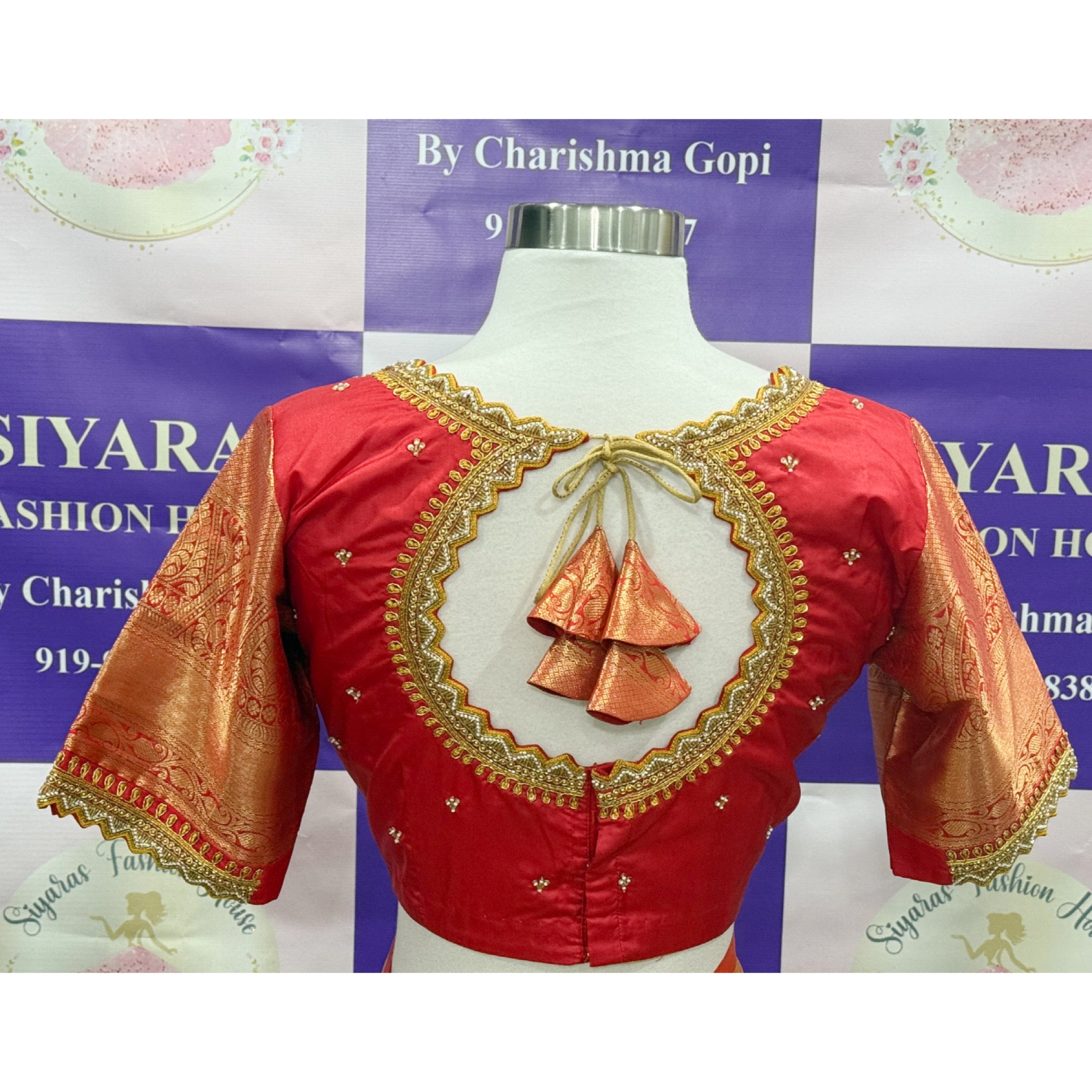 This stunning Kanchi Pattu Saree in vibrant yellow with a rich red border is paired with a Maggam work blouse that steals the spotlight with its intricate craftsmanship. Available in size 40 upto 42.