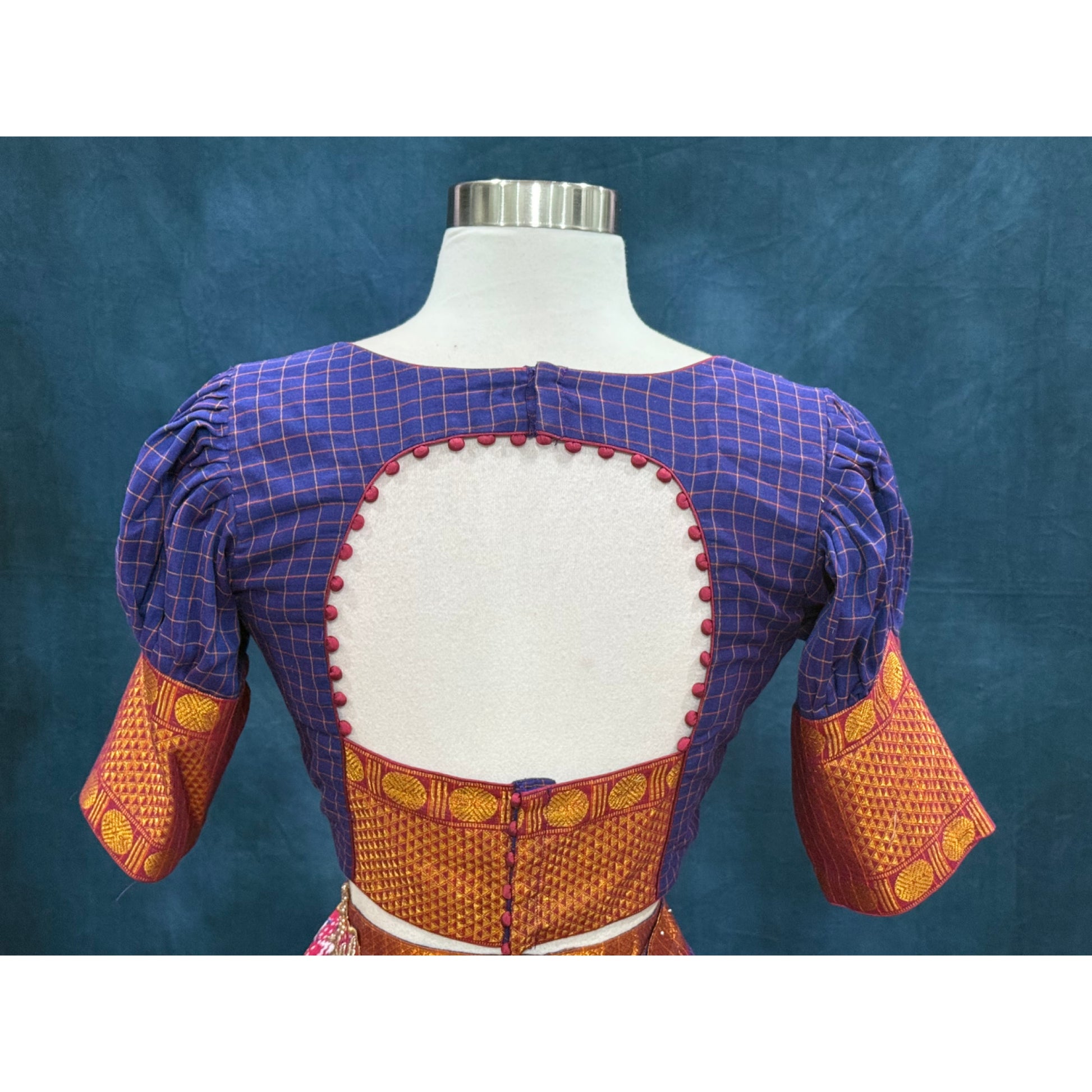Traditional customized narayanpet cotton half saree , langa voni brinjal Color with zari border size 38 to 42