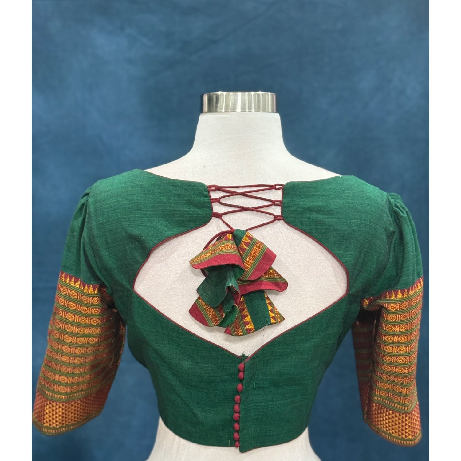 Traditional customized narayanpet cotton half saree , langa voni greed and red color combo size 38 to 42