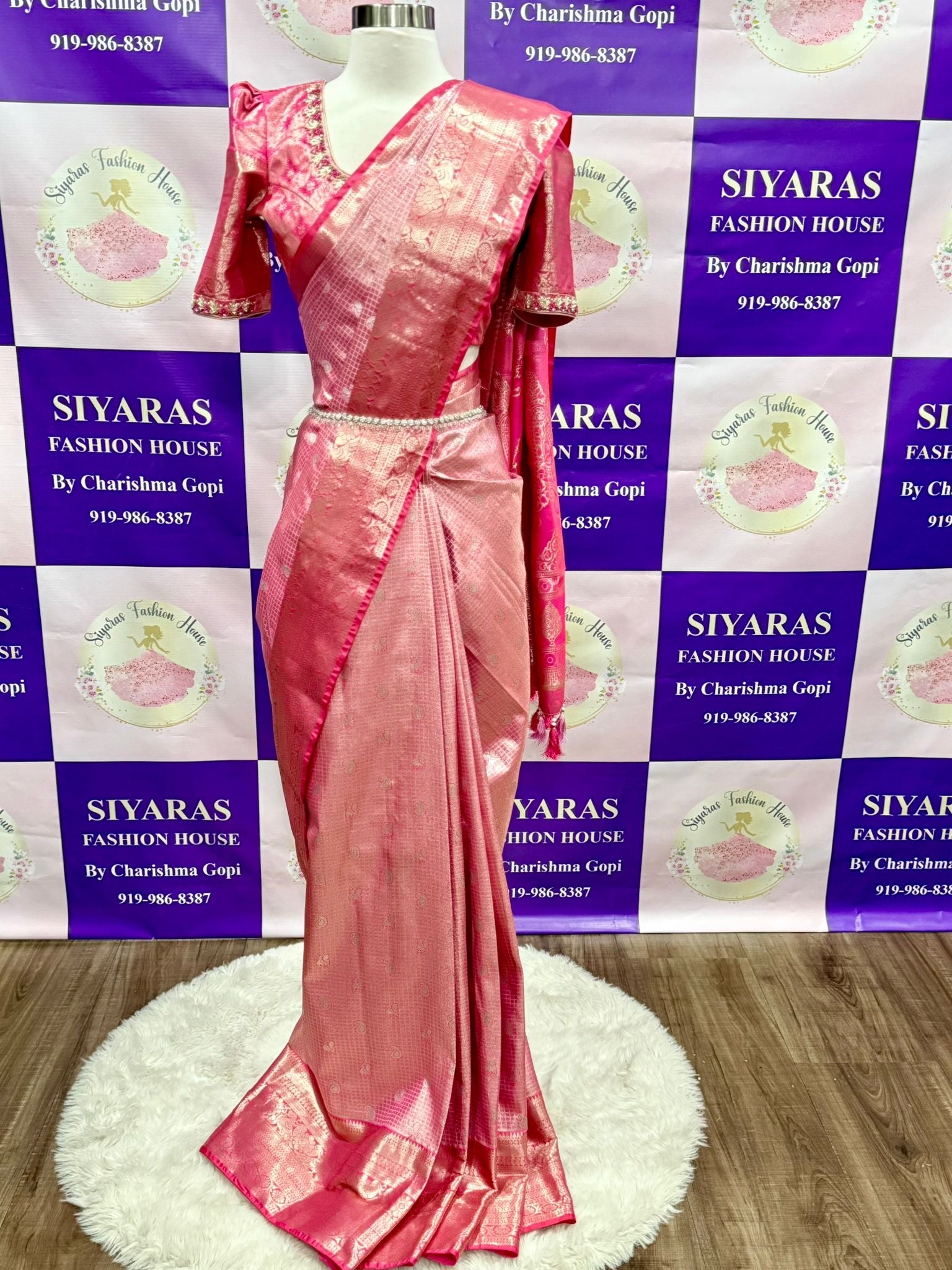 Traditional yet chic style in this kanchi tissue Saree with kanchi border and a stitched Maggam work blouse.